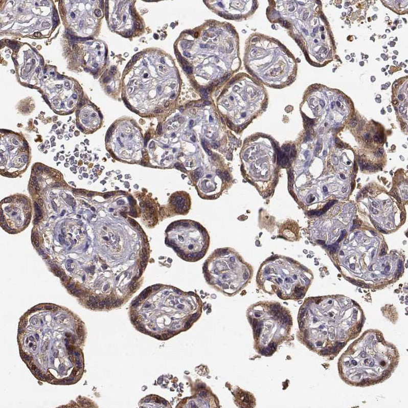 Immunohistochemistry analysis in human placenta and liver tissues using HPA000556 antibody. Corresponding CRIM1 RNA-seq data are presented for the same tissues.