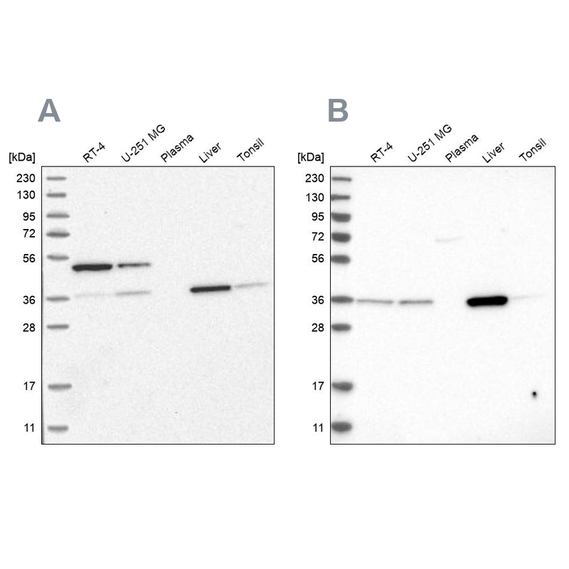 Immunohistochemical staining of human liver shows strong positivity in hepatocytes and bile duct cells.