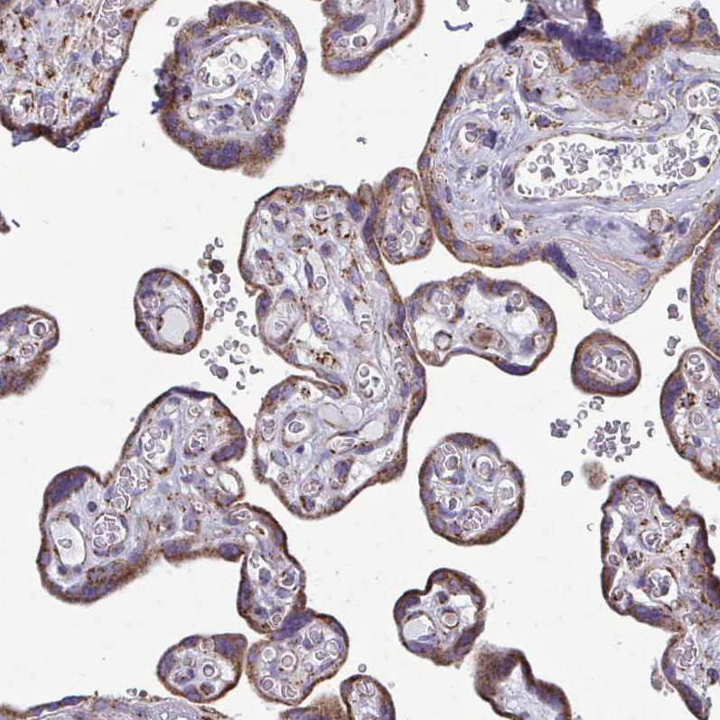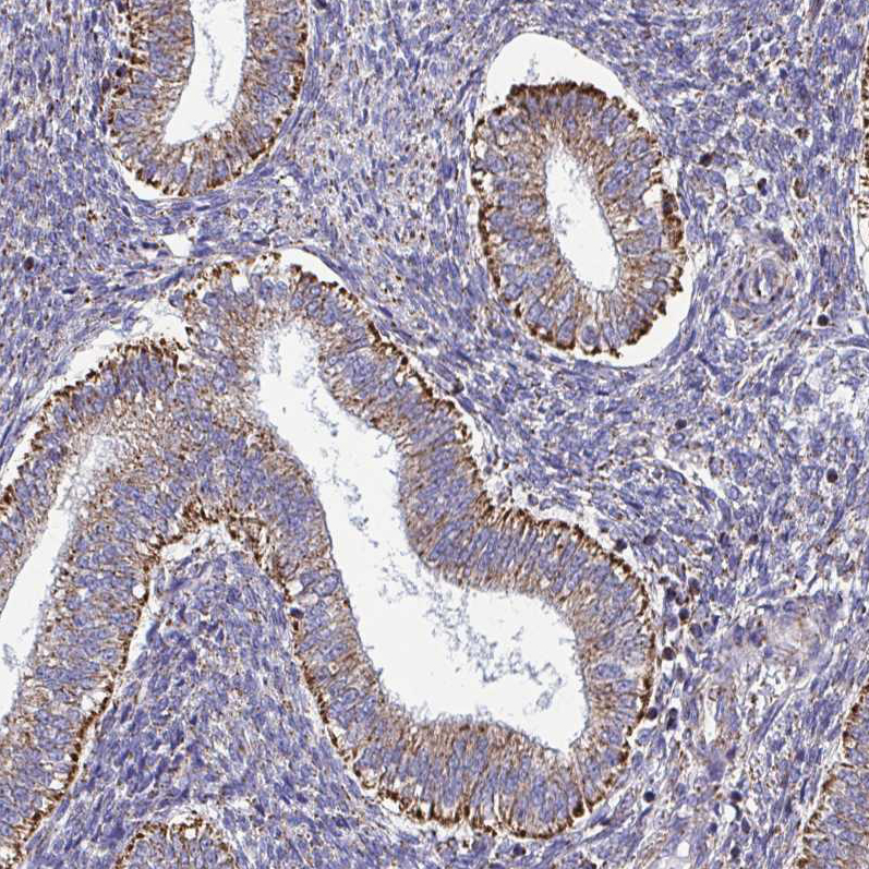 Immunohistochemical staining of human prostate shows strong granular positivity in cytoplasm in glandular cells.