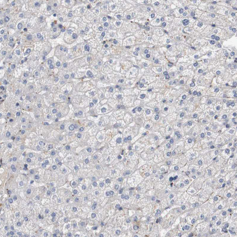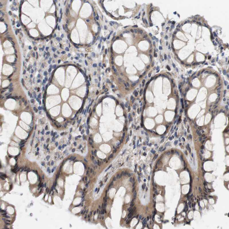 Immunohistochemical staining of human pancreas shows moderate cytoplasmic positivity in exocrine glandular cells.