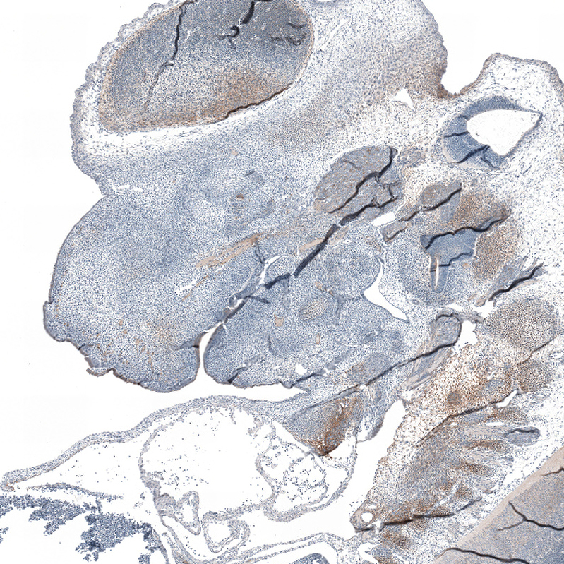 Immunohistochemistry analysis in human small intestine and placenta tissues using HPA052033 antibody. Corresponding DAB1 RNA-seq data are presented for the same tissues.