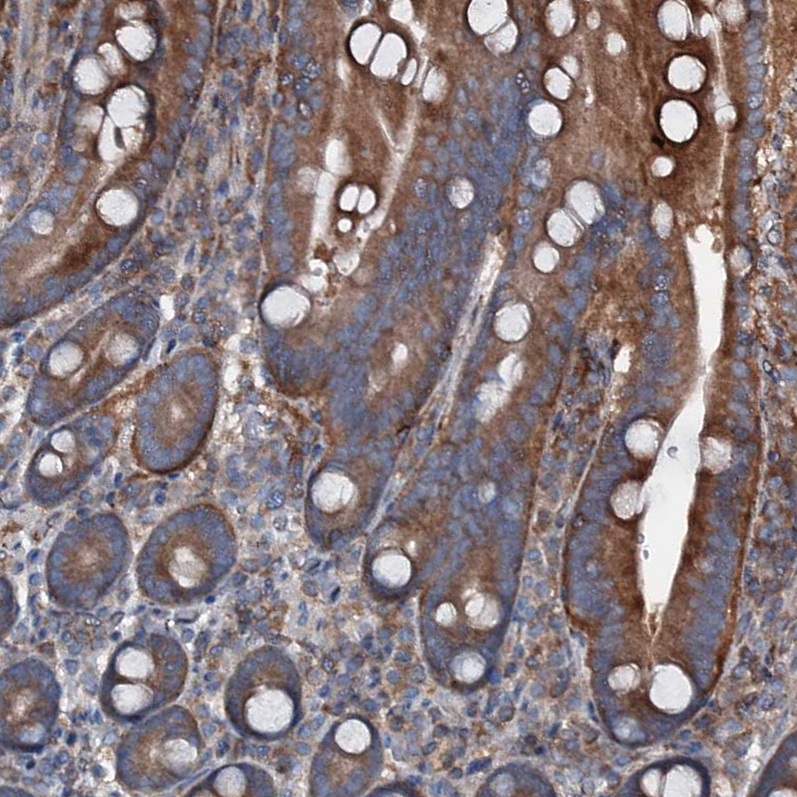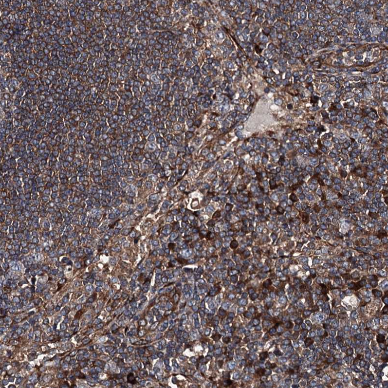 Immunohistochemical staining of human testis shows strong cytoplasmic positivity in cells in seminiferous ducts.