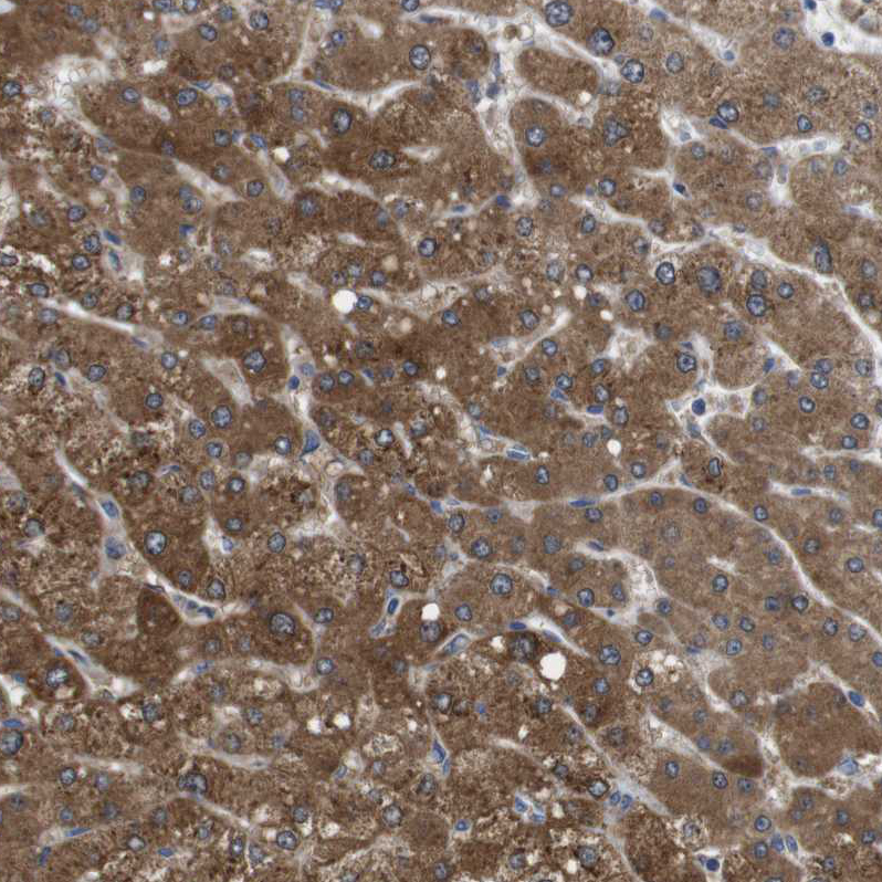 Immunohistochemical staining of human adrenal gland shows strong cytoplasmic positivity in glandular cells.