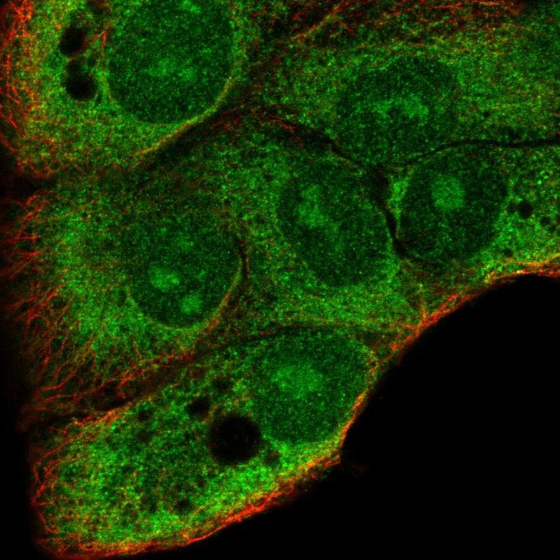 Immunofluorescent staining of human cell line HaCaT shows localization to nucleoli & endoplasmic reticulum.