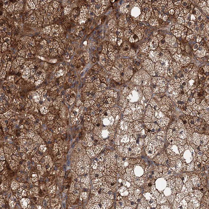 Immunohistochemical staining of human heart muscle shows moderate to strong cytoplasmic positivity in cardiomyocytes.