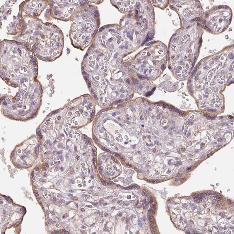 Immunohistochemical staining of human bronchus shows strong cytoplasmic positivity in respiratory epithelial cells.