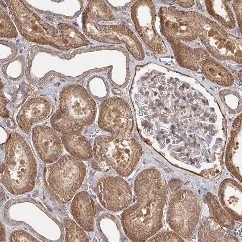 Immunohistochemical staining of human small intestine shows strong cytoplasmic positivity in glandular cells.