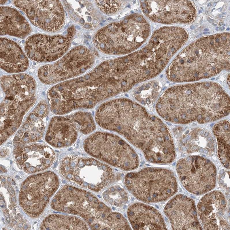 Immunohistochemical staining of human testis shows moderate granular cytoplasmic positivity in seminiferous ducts.