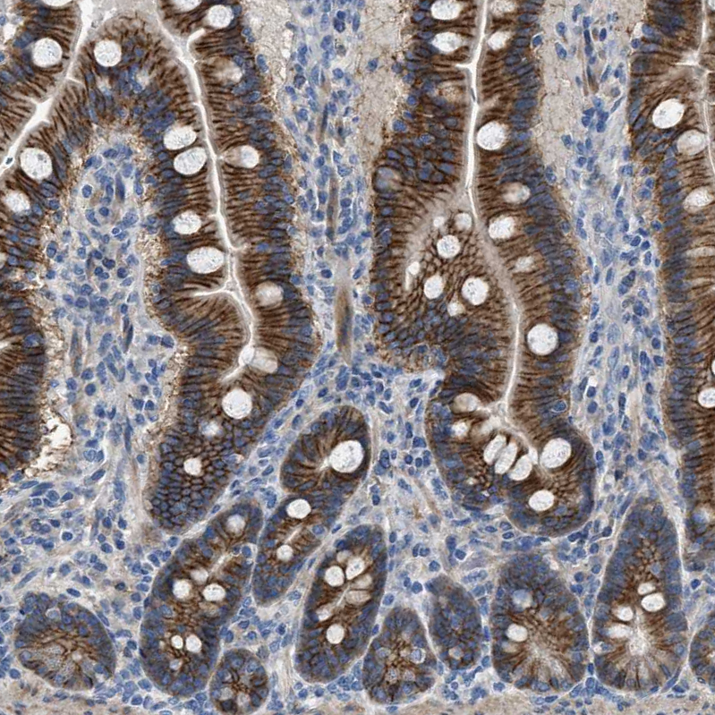 Immunohistochemical staining of human testis shows moderate cytoplasmic positivity in cells in seminiferous ducts.