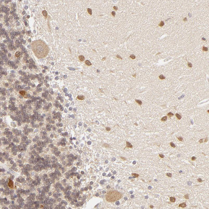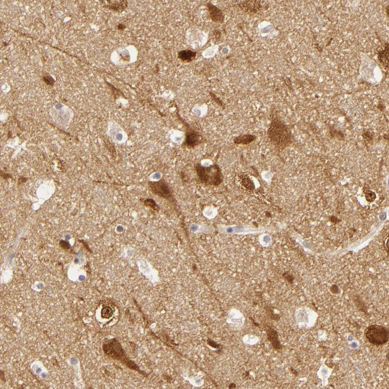 Immunohistochemical staining of human hippocampus shows strong cytoplasmic positivity in neurons.
