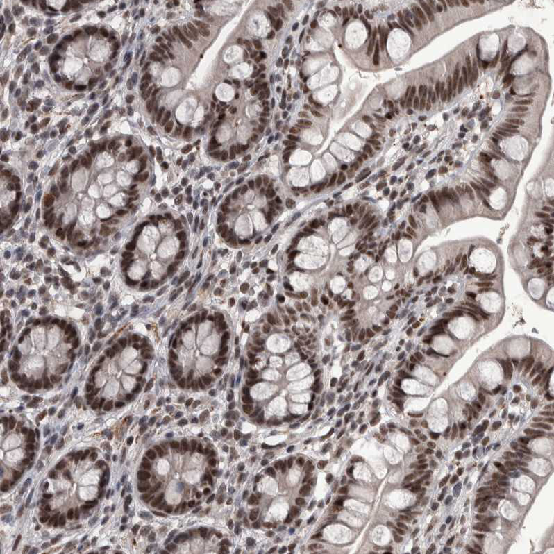 Immunohistochemical staining of human testis shows strong nuclear positivity in cells in seminiferous ducts.