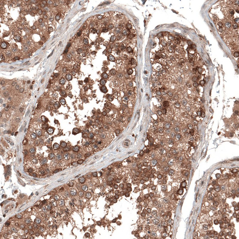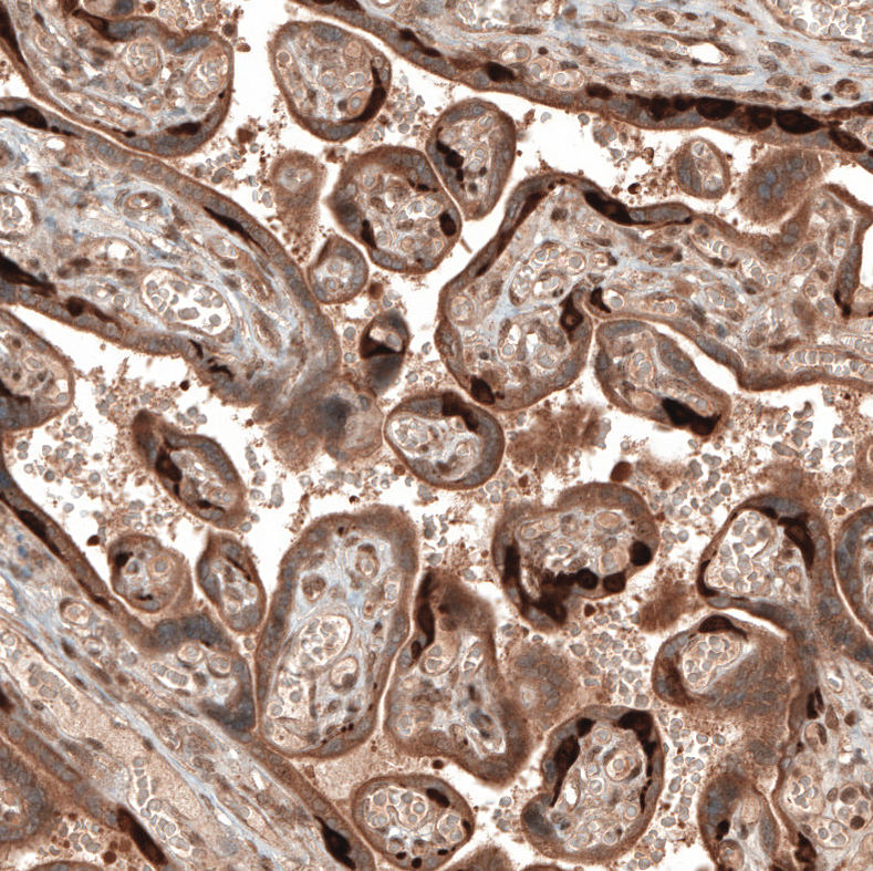 Immunohistochemical staining of human prostate shows moderate to strong cytoplasmic positivity in glandular cells.
