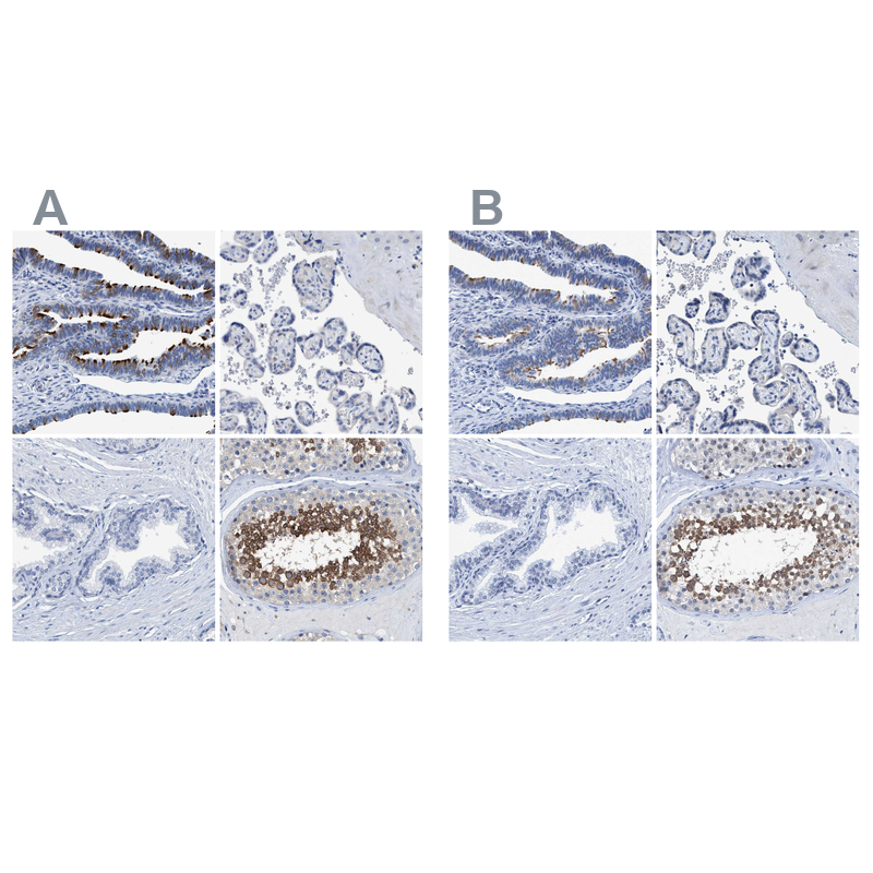 Immunohistochemistry analysis in human testis and prostate tissues using HPA021649 antibody. Corresponding DNAI1 RNA-seq data are presented for the same tissues.