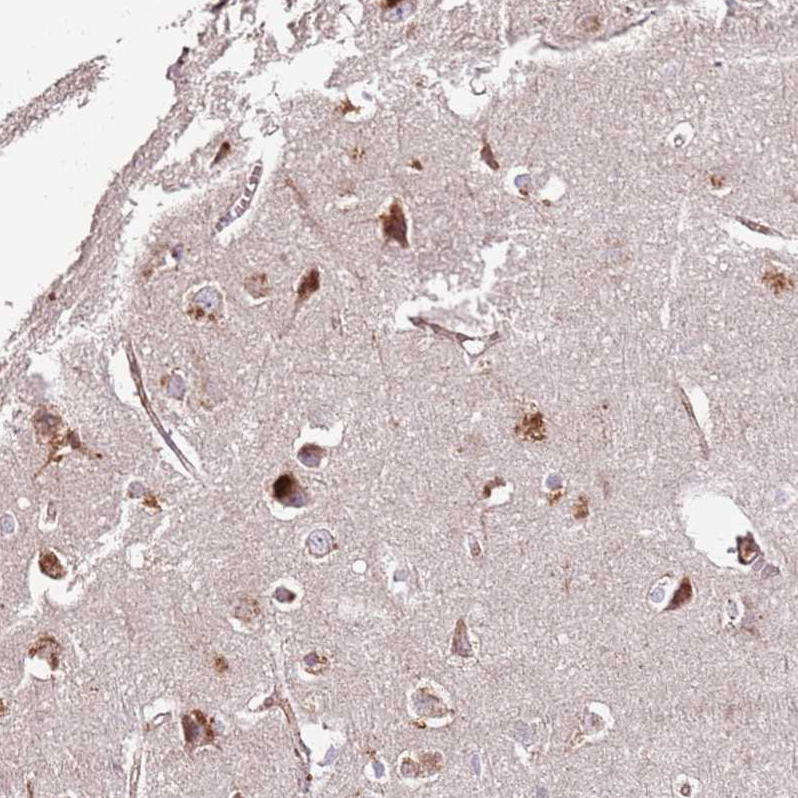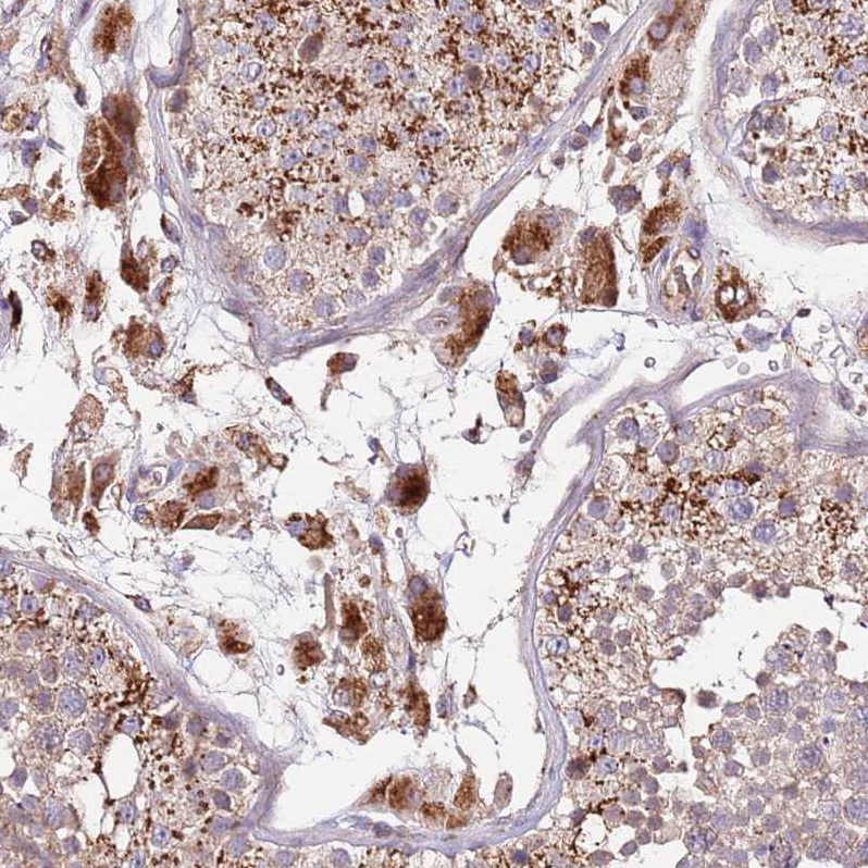 Immunohistochemical staining of human lung shows moderate granular cytoplamsic positivity in macrophages.