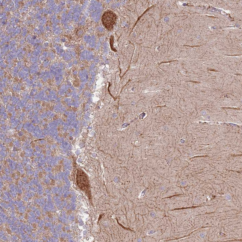 Immunohistochemical staining of human stomach shows moderate to strong cytoplasmic positivity in glandular cells.