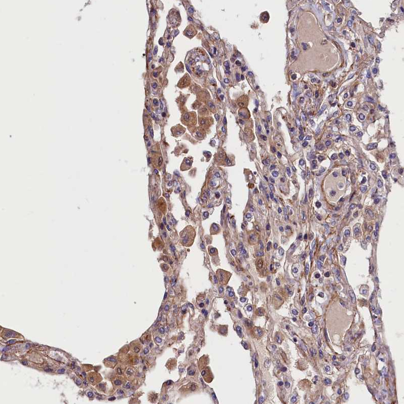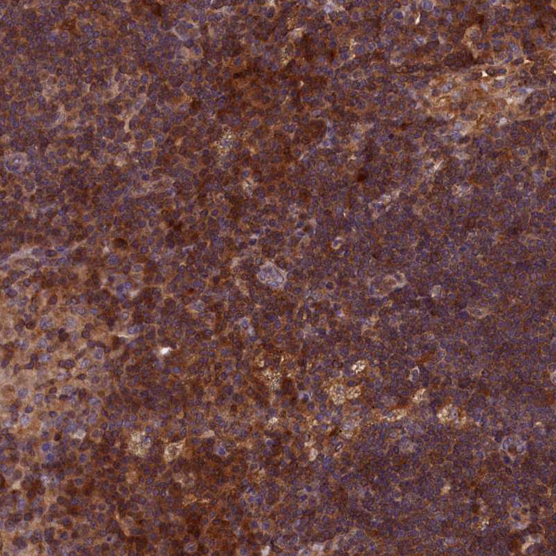 Immunohistochemical staining of human skin shows strong cytoplasmic positivity in squamous epithelial cells.