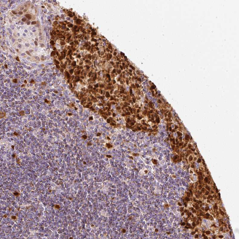 Immunohistochemistry analysis in human lymph node and liver tissues using HPA054422 antibody. Corresponding DUT RNA-seq data are presented for the same tissues.