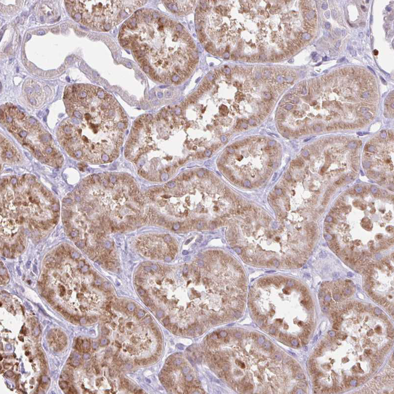 Immunohistochemical staining of human cerebellum shows strong cytoplasmic positivity in Purkinje cells.