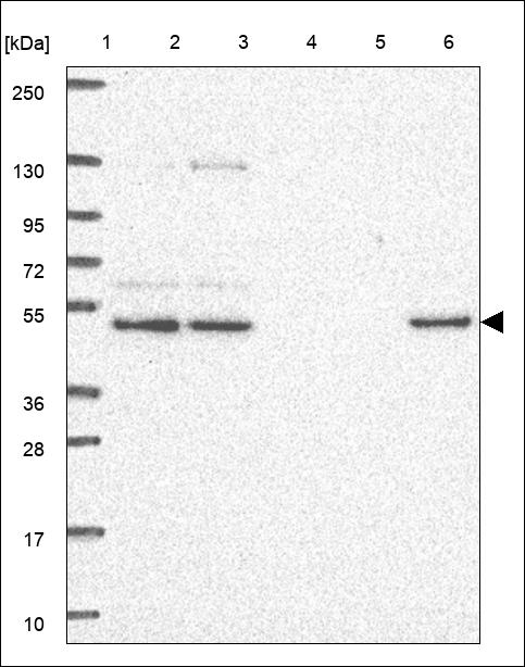 Lane 1: Marker [kDa] 250,130,95,72,55,36,28,17,10<br/>Lane 2: RT4<br/>Lane 3: U-251 MG<br/>Lane 4: Human Plasma<br/>Lane 5: Liver<br/>Lane 6: Tonsil