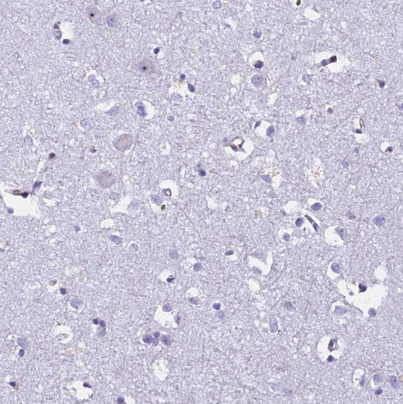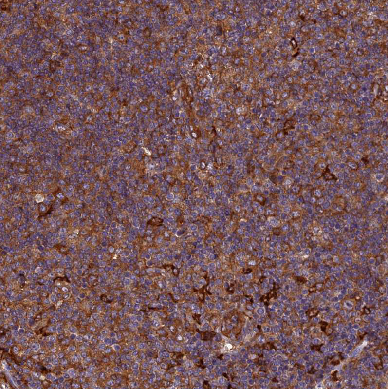 Immunohistochemical staining of human skeletal muscle shows moderate cytoplasmic positivity in myocytes.