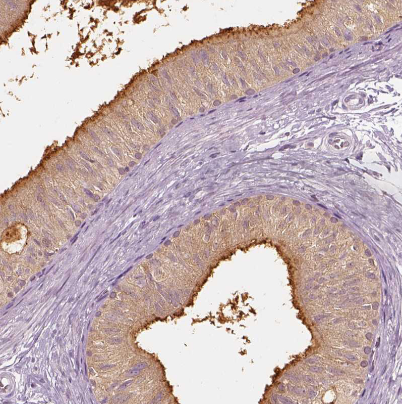 Immunohistochemistry analysis in human epididymis and prostate tissues using HPA044256 antibody. Corresponding ELSPBP1 RNA-seq data are presented for the same tissues.