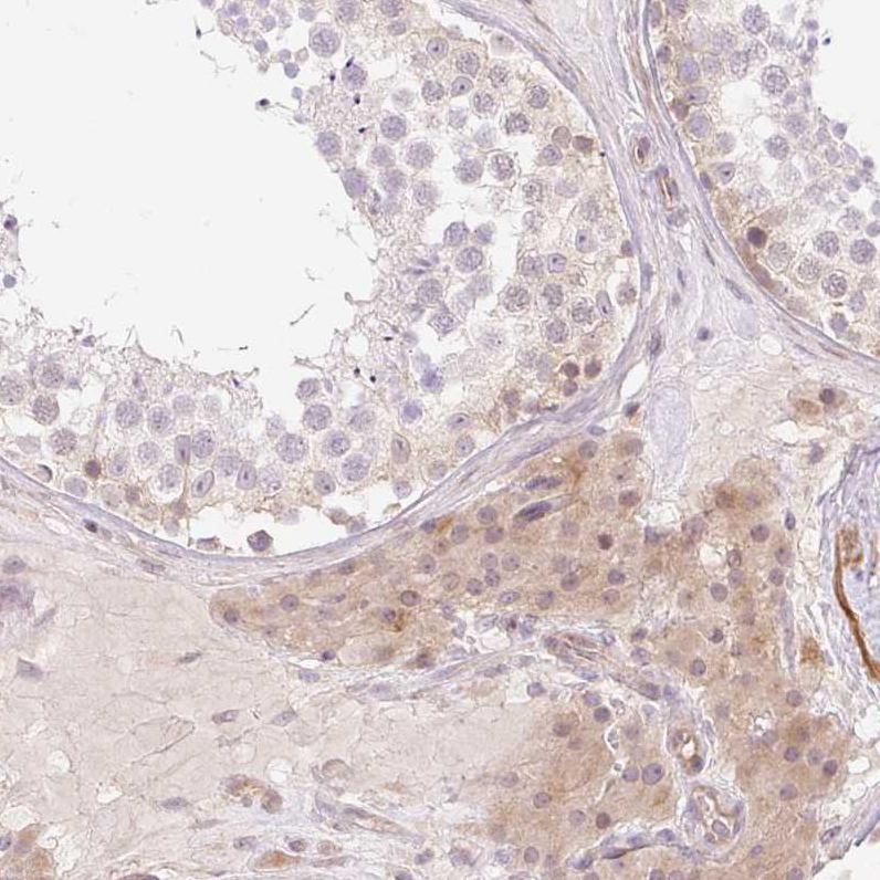 Immunohistochemical staining of human skeletal muscle shows moderate cytoplasmic positivity in myocytes.