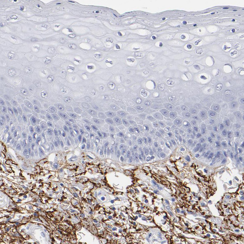 Immunohistochemical staining of human prostate shows strong membranous positivity in smooth muscle cells.