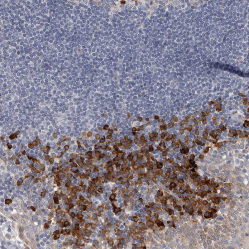 Immunohistochemical staining of human skeletal muscle shows moderate cytoplasmic positivity in myocytes.