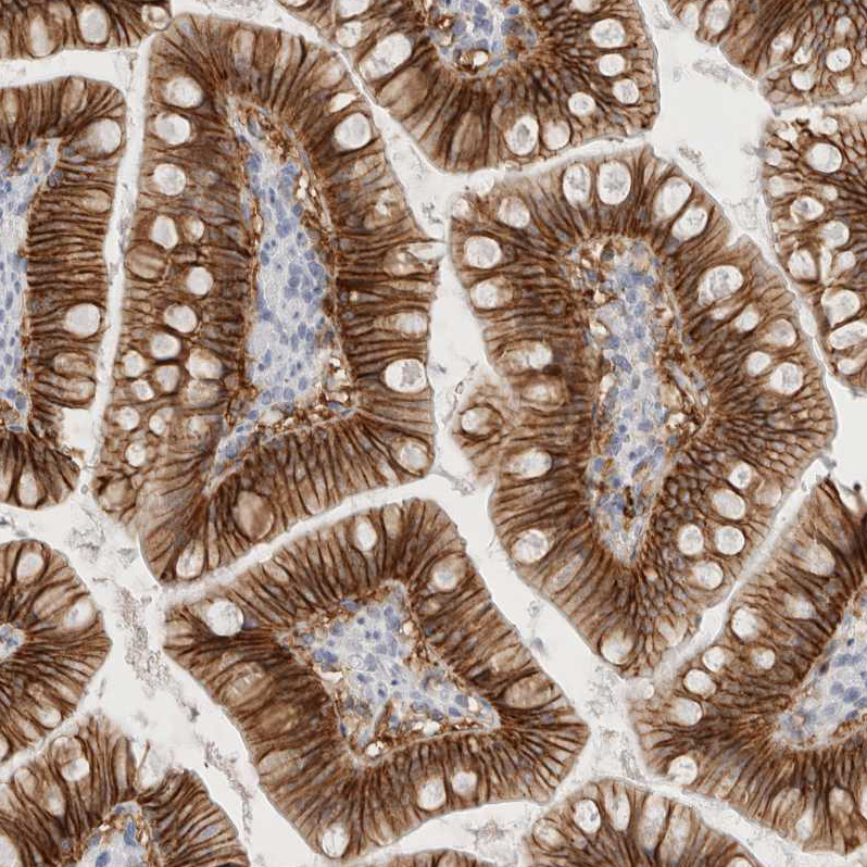 Immunohistochemistry analysis in human small intestine and placenta tissues using HPA026761 antibody. Corresponding EPCAM RNA-seq data are presented for the same tissues.