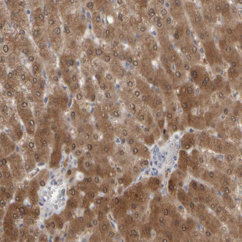 Immunohistochemical staining of human duodenum shows moderate cytoplasmic positivity in glandular cells.