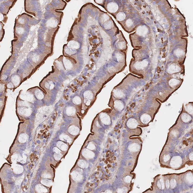 Immunohistochemical staining of human breast shows strong membranous positivity in myoepithelial cells.