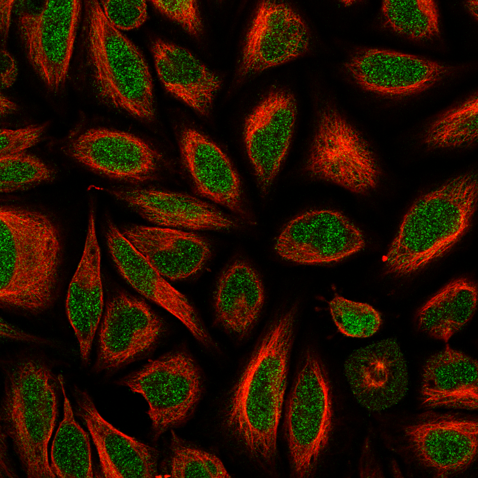 Immunofluorescent staining of human cell line HeLa using Anti-ERCC6L2 antibody HPA022422, showing protein localization to nucleus (green). Microtubule and nuclear probes are visualized in red and blue, respectively (where available).