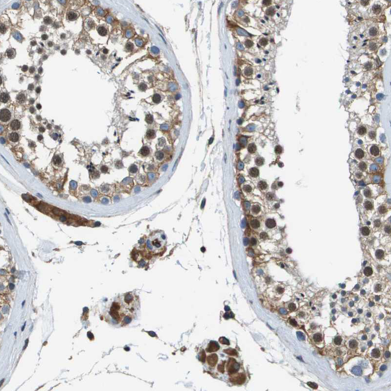Immunohistochemical staining of human fallopian tube shows moderate cytoplasmic positivity in glandular cells and endothelial cells.