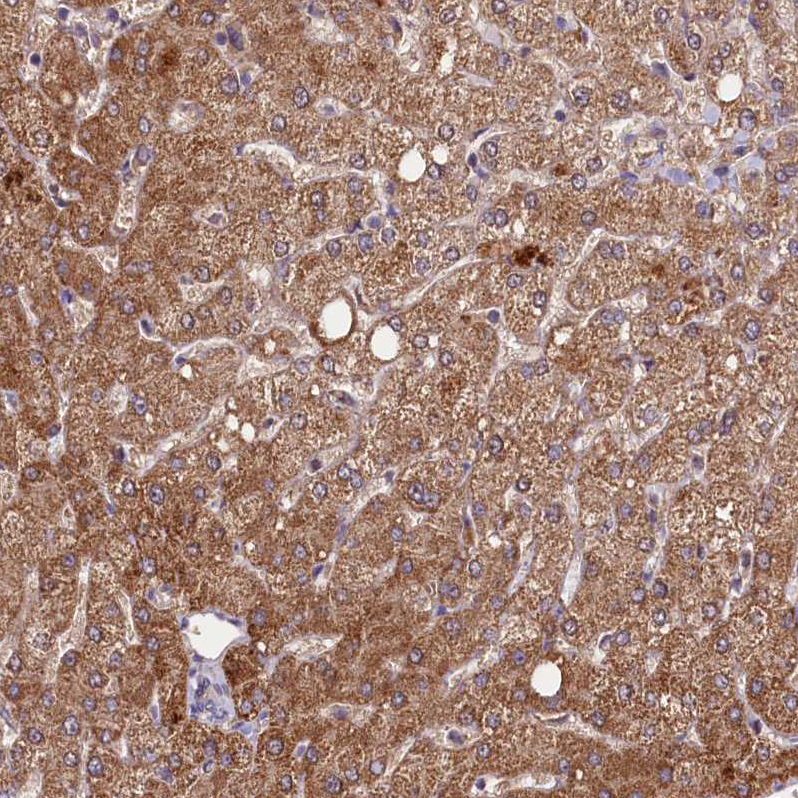 Immunohistochemical staining of human kidney shows strong cytoplasmic positivity in cells in tubules.