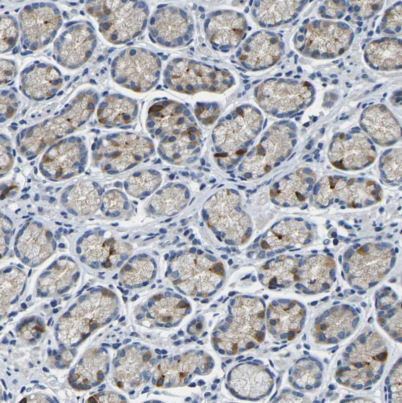 Immunohistochemical staining of human pancreas shows strong cytoplasmic positivity in islets of Langerhans.