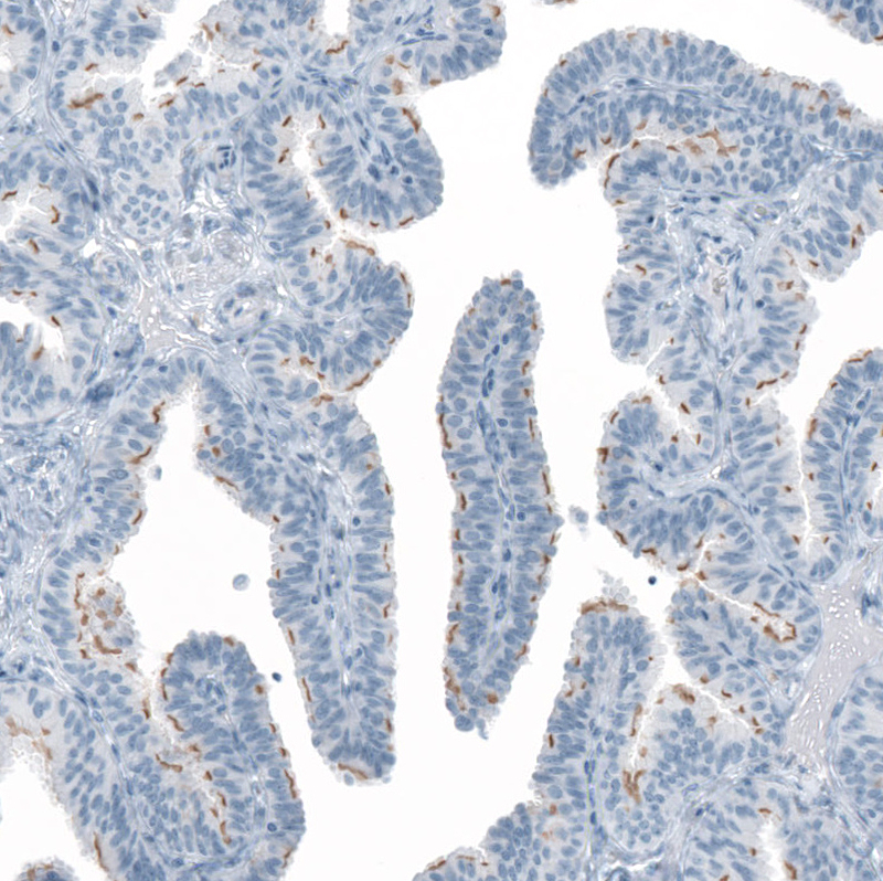 Immunohistochemical staining of human outer plexiform layer shows moderate positivity in cilium basal body.