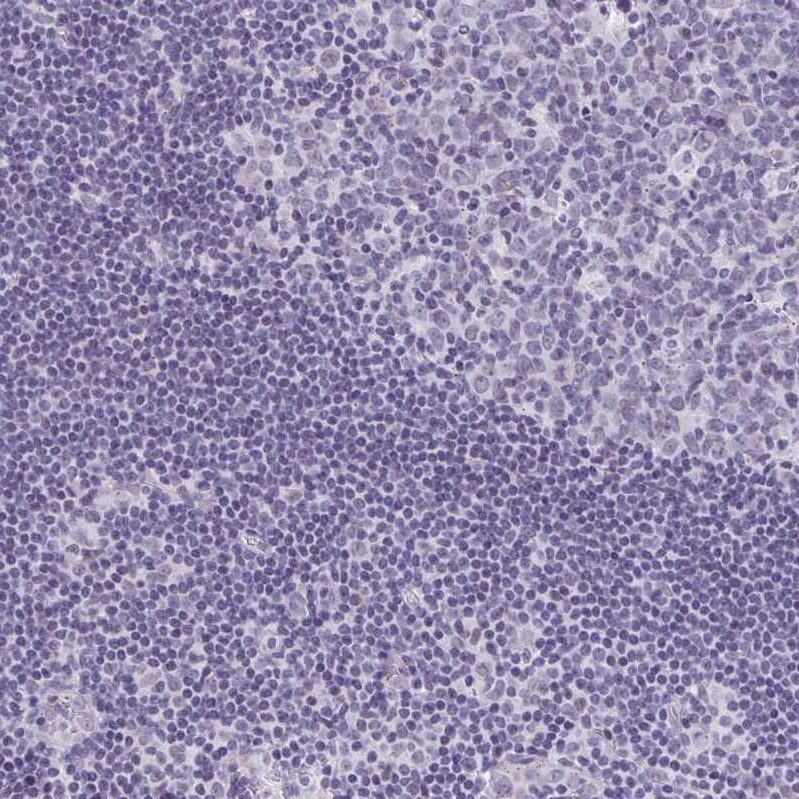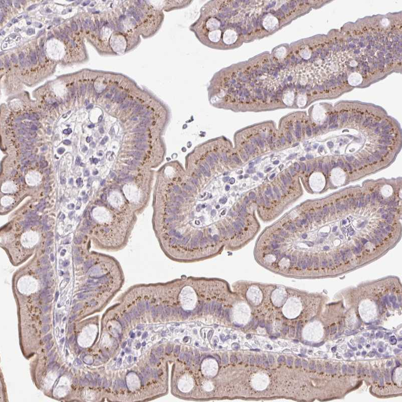 Immunohistochemical staining of human small intestine shows strong cytoplasm granular positivity in glandular cells.