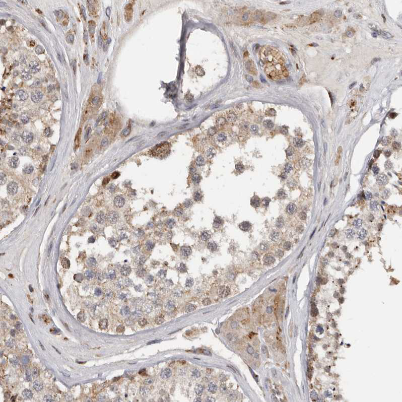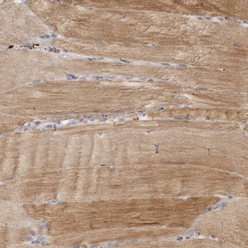 Immunohistochemical staining of human skeletal muscle shows moderate cytoplasmic positivity in myocytes.