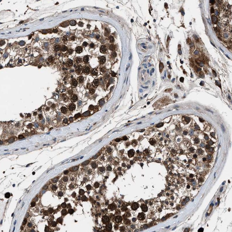 Immunohistochemistry analysis in human testis and endometrium tissues using Anti-FAM221A antibody. Corresponding FAM221A RNA-seq data are presented for the same tissues.