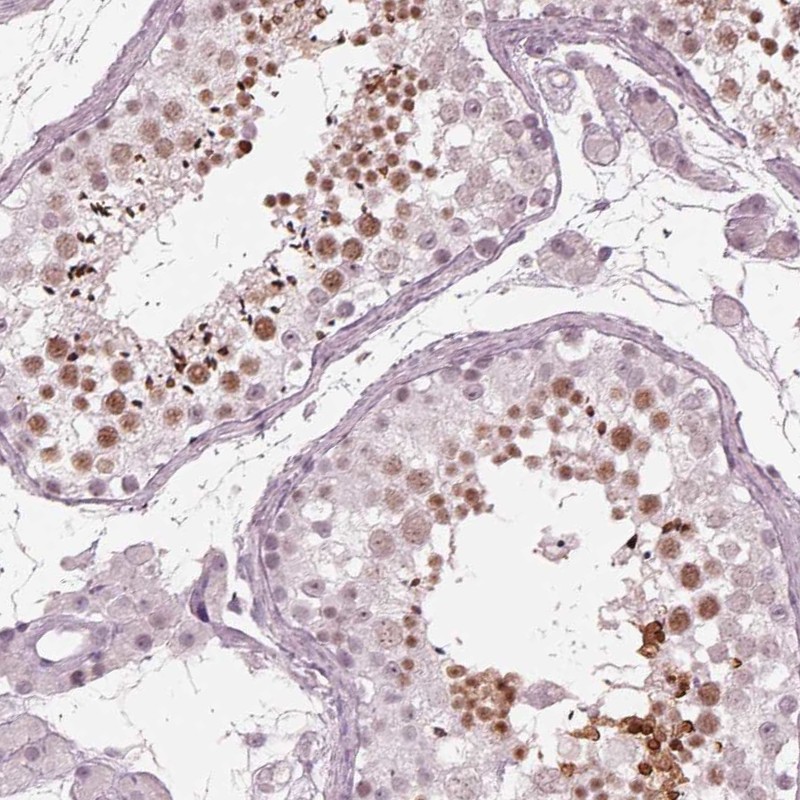 Immunohistochemistry analysis in human testis and endometrium tissues using Anti-FAM71A antibody. Corresponding FAM71A RNA-seq data are presented for the same tissues.