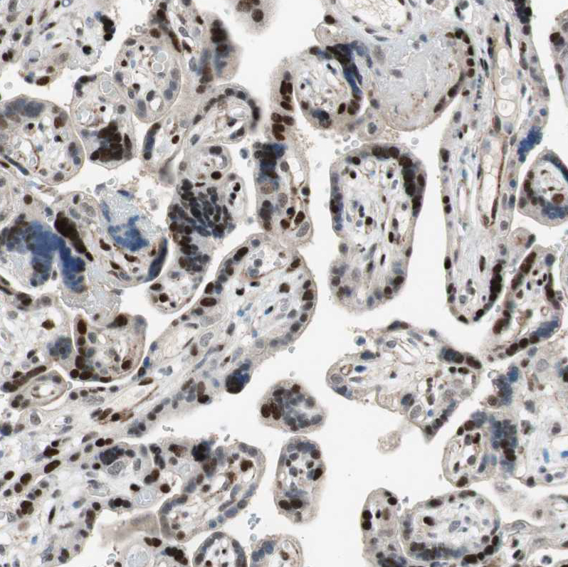 Immunohistochemical staining of human brain shows strong nuclear and cytoplasmic positivity in neurons.