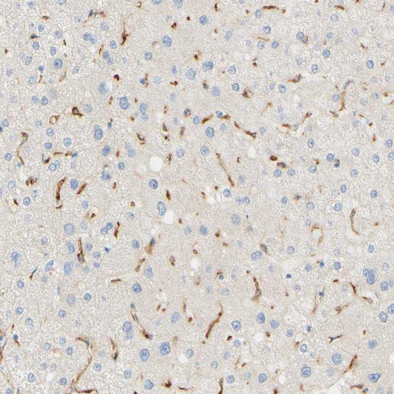 Immunohistochemical staining of human placenta shows moderate to strong cytoplasmic positivity in Hofbauer cells.