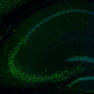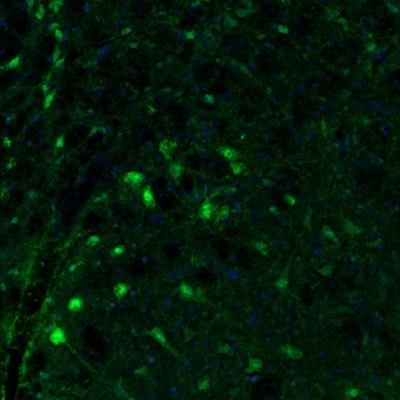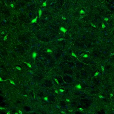Immunofluorescence staining of mouse olfactory bulb shows neuronal positivity in the anterior olfactory nucleus.