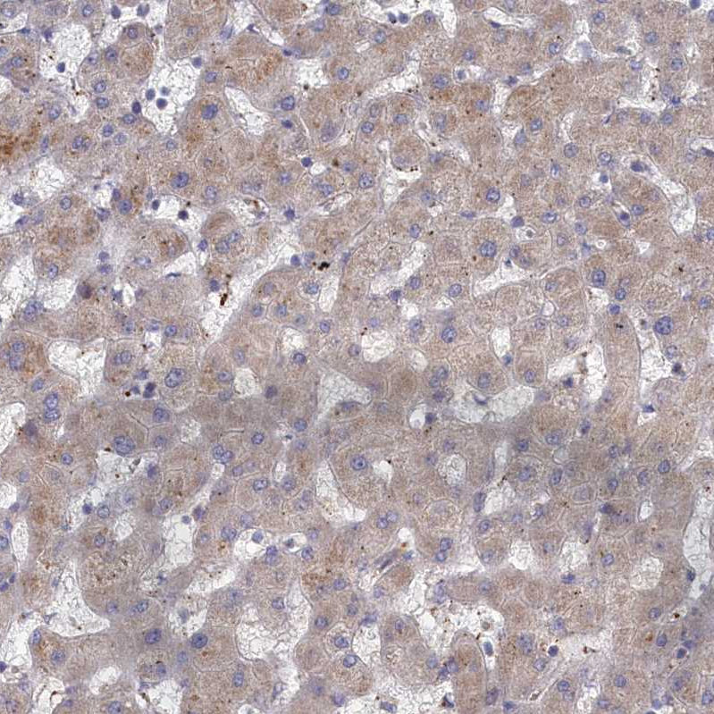 Immunohistochemical staining of human prostate shows moderate cytoplasmic positivity in smooth muscle cells.