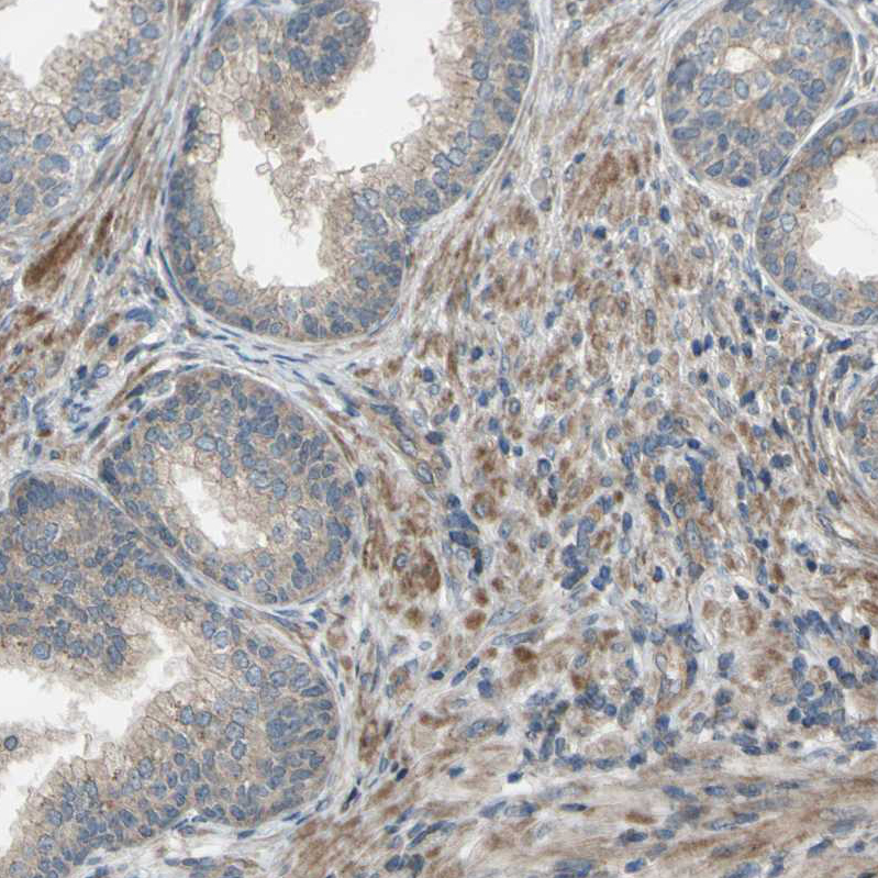 Immunohistochemical staining of human skeletal muscle shows moderate cytoplasmic positivity in myocytes.