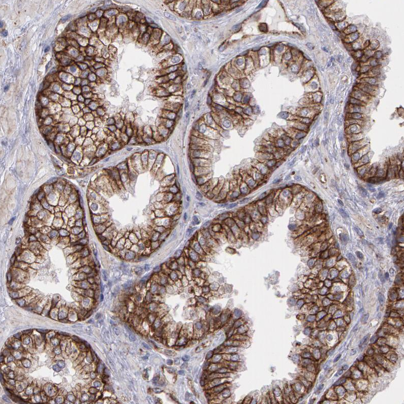 Immunohistochemical staining of human lymph node shows strong membranous positivity in germinal center cells.