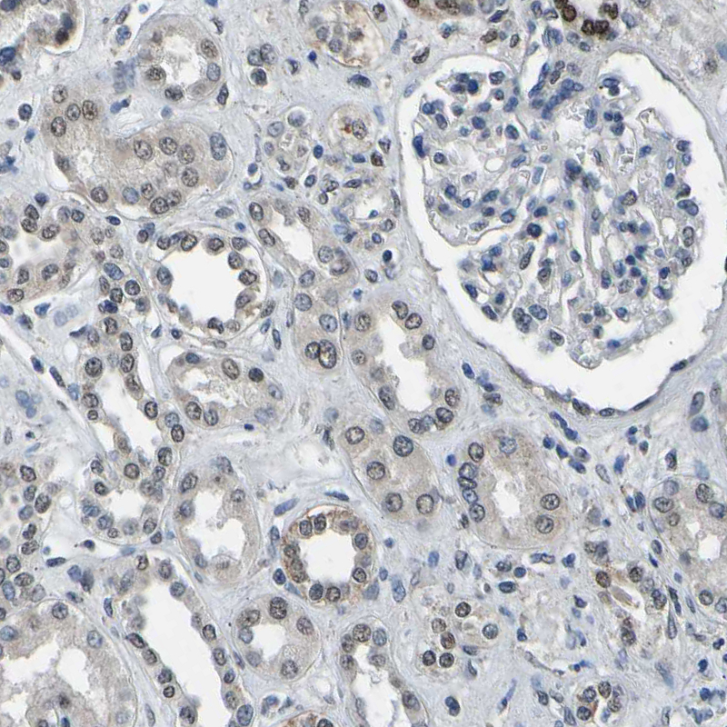 Immunohistochemical staining of human cervix, uterine shows moderate to strong nuclear positivity in squamous epithelial cells.