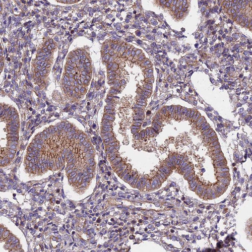 Immunohistochemical staining of human endometrium shows moderate to strong cytoplasmic positivity in glandular cells.