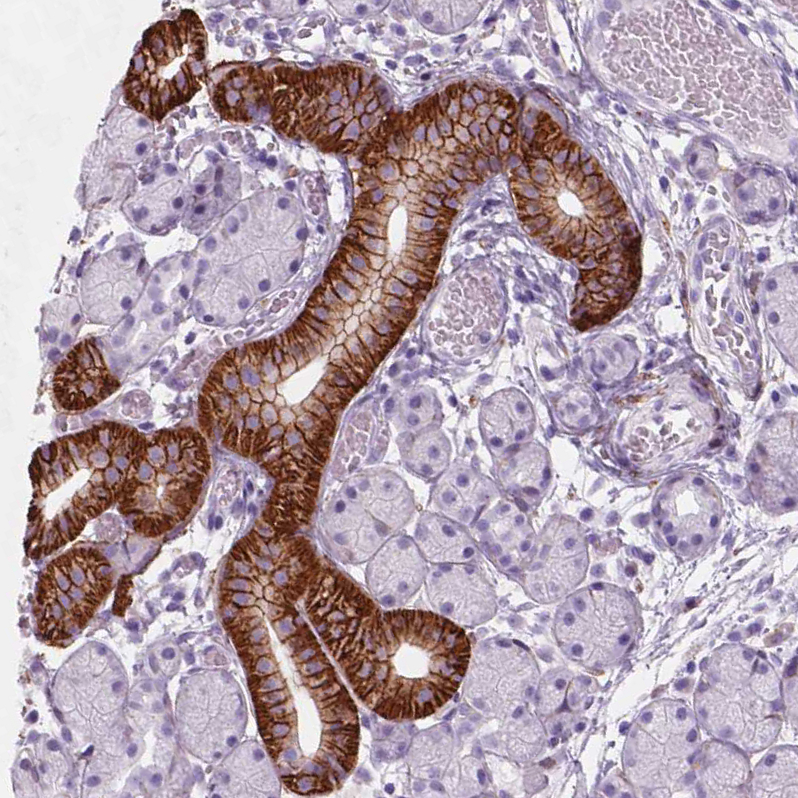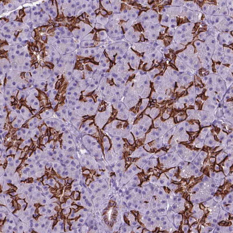 Immunohistochemical staining of human kidney shows strong membranous positivity in cells in tubules.
