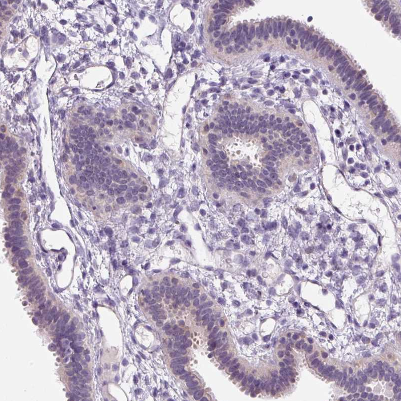 Immunohistochemical staining of human duodenum shows moderate membranous positivity in glandular cells.